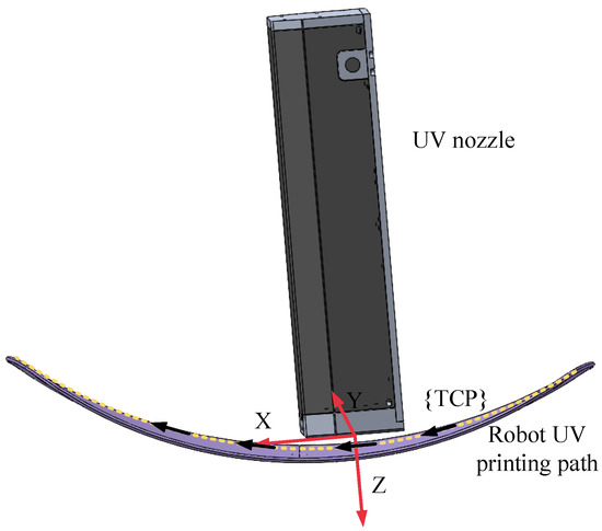 The five-axis CNC machine tool has five degrees of freedom, namely ,, directions and , axes, whereas the six-axis robot has six degrees of freedom: ,,, and . The main difference between them lies in the sixth degree of freedom. Assuming that the Cartesian coordinate sequence of the spray printing path is , where the i- point is represented as , the spray head is required to maintain a stable posture during the printing process to ensure that the {TCP} remains perpendicular to the printed component at all times [29]. The Z-axis direction of the {TCP} is defined to be opposite to the surface normal vector direction, as shown in Figure 2. The description of the spray head {TCP} can be expressed as: