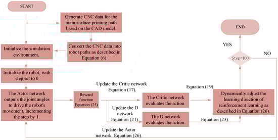 However, the limitations of this paper lie in considering only the accuracy and smoothness of the printing path. Nozzle collision is a critical factor affecting printing accuracy and stability, especially when the robot’s end-effector approaches complex surfaces or irregular objects. To address this issue, future research will integrate obstacle avoidance algorithms and introduce obstacle avoidance constraints in the path planning process, incorporating them into the reinforcement learning reward function to ensure that the robot nozzle maintains a safe distance from the workpiece surface, effectively preventing nozzle-workpiece collisions. Additionally, during the reinforcement learning training process, the computation of large amounts of training data and high-dimensional state space may lead to long training times and excessive computational resource consumption. To improve the algorithm’s efficiency, future research will explore distributed computing frameworks to parallel process multiple training environments, reducing training time and computational costs, or use transfer learning techniques to pre-train models in similar tasks or environments, reducing training time and improving algorithm convergence speed.