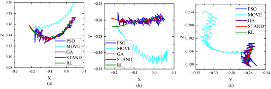 In the UV printing process, the smoothness of the robot’s end-effector motion in Cartesian space significantly affects the printing quality. The intensity of velocity fluctuations directly determines the uniformity and consistency of the ink ejected from the nozzle. Therefore, this paper compares the velocity variations in the X, Y, and Z directions across different path planning algorithms, with the experimental results shown in Figure 16. From the velocity variation curves, it is evident that the traditional path planning algorithm (MOVE) exhibits the most significant trajectory jitter and velocity fluctuations, particularly in the Y direction, where substantial jumps are observed, indicating unstable motion that fails to meet the precise printing requirements. In contrast, the GA and PSO algorithms demonstrate improvements in velocity smoothness, with their velocity curves being more stable than that of MOVE. Specifically, PSO has smaller fluctuations in the Z direction, while GA performs relatively better in the X direction. The RL (GAIL-SAC) algorithm shows the least velocity variation and the smoothest trajectory, with the velocity variation in the X, Y, and Z directions significantly reduced, indicating the best trajectory smoothness during actual robot operation.