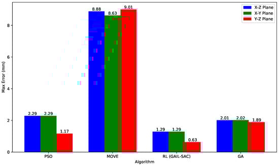 To further quantify the smoothness of the different algorithms, this paper calculates the standard deviation of the velocity variation rate in the X, Y, and Z directions. The experimental results are shown in Figure 17. The analysis reveals that the MOVE algorithm has the highest velocity variation rate standard deviation, with values of 1474.8, 1919.1, and 1326.8 in the X, Y, and Z directions, respectively, indicating large trajectory fluctuations and poor motion smoothness. Both GA and PSO algorithms show improvements in smoothness in all directions, with a significant reduction in velocity fluctuations compared to the MOVE algorithm. Specifically, PSO reduces the standard deviation in the Z direction to 602.6, while GA reduces the standard deviation in the Y direction to 950.3, reflecting the distinct optimization advantages of both algorithms in different directions. However, the RL (GAIL-SAC) algorithm achieves the lowest velocity variation rate standard deviation, with values of 4.18, 4.67, and 4.32 in the X, Y, and Z directions, respectively. This indicates that the RL algorithm provides the smoothest trajectory in all directions, effectively reducing velocity fluctuations and enhancing motion stability. Overall, while GA and PSO improve the trajectory smoothness in Cartesian space to some extent, the RL (GAIL-SAC) algorithm performs best, effectively suppressing velocity jumps and ensuring the stability of the printing process, thereby further improving print quality.