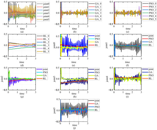 Comparison chart of joint space smoothness. (a)Velocity fluctuations in joint space for the conventional path planning algorithm. (b) Velocity fluctuations in joint space for the Genetic Algorithm (GA). (c) Velocity fluctuations in joint space for the Particle Swarm Optimization (PSO) algorithm. (d) Velocity fluctuations in joint space for the GAIL-SAC algorithm. (e) Comparative analysis of velocity fluctuations in joint 0 across algorithms. (f) Comparative analysis of velocity fluctuations in joint 1 across algorithms. (g) Comparative analysis of velocity fluctuations in joint 2 across algorithms. (h) Comparative analysis of velocity fluctuations in joint 3 across algorithms. (i) Comparative analysis of velocity fluctuations in joint 4 across algorithms. (j) Comparative analysis of velocity fluctuations in joint 5 across algorithms.