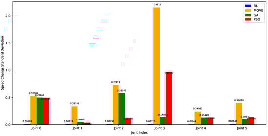 To further quantify the velocity variations and analyze the smoothness of different algorithms in detail, Figure 13 presents the standard deviation of velocity fluctuations in joint space. The velocity variation standard deviation serves as a quantitative measure of motion smoothness, where lower values indicate a smoother trajectory. In Figure 13, the GAIL-SAC algorithm exhibits a significantly lower velocity variation standard deviation compared to other algorithms, particularly at joint 2, where its standard deviation is only 0.00795, far lower than that of the GA algorithm (0.729) and the PSO algorithm (0.58). Similar trends are observed across other joints. Therefore, combining the visual comparison in Figure 12 and the quantitative analysis in Figure 13, the GAIL-SAC algorithm demonstrates a distinct advantage in joint space smoothness, achieving the lowest velocity variation standard deviation across all joints, thus exhibiting the optimal motion smoothness. The experimental results confirm that the GAIL-SAC algorithm outperforms the conventional path planning algorithm, GA, and PSO in improving the smoothness of robotic motion.