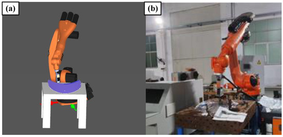 Before the experiments commenced, we established a simulated environment that closely resembled the actual printing process to ensure safety and protect the UV print head. During the simulation, the robot’s movement trajectories were validated to prevent any collisions or unexpected incidents during operation. The printing robot used in this experiment was the KUKA KR210 model, with its simulated environment illustrated in Figure 14a and the corresponding actual experimental setup shown in Figure 14b.