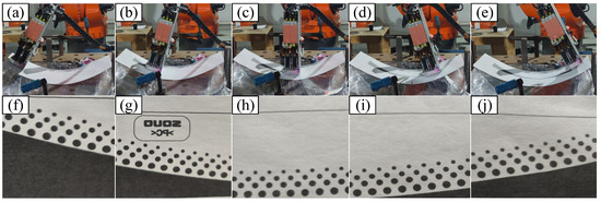 As shown in Figure 15, Figure 15a–e illustrate the robot’s movement positions at various stages of the printing process. Throughout this process, it is crucial for the TCP of the print head to remain perpendicular to the surface of the printed workpiece to meet the requirements of UV printing. The actual results align well with the simulation outcomes. Figure 15f–j correspond to the printing results at each movement stage. The printed results demonstrate that the proposed algorithm effectively meets the demands of practical processing.
