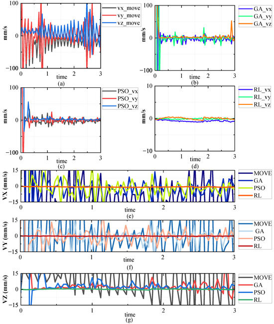 Comparison chart of smoothness in Cartesian space. (a) Cartesian space velocity variation plot of the conventional path planning algorithm. (b) Cartesian space velocity variation plot of the GA algorithm. (c) Cartesian space velocity variation plot of the PSO algorithm. (d) Cartesian space velocity variation plot of the GAIL-SAC algorithm. (e) Comparison of velocity variation in the X-axis direction for different algorithms. (f) Comparison of velocity variation in the Y-axis direction for different algorithms. (g) Comparison of velocity variation in the Z-axis direction for different algorithms.