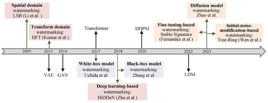 The timeline for technologies of watermarking and image generation [42,43,44,45,46,47,48,49].