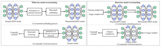 Black-box model watermarking schemes [77,78,79] can overcome this limitation. In these schemes, the model’s copyright verifier only needs to query the model’s API interface, without accessing the model’s internal structure. The general framework of the black-box model watermarking scheme [80] is as follows: (1) during the watermark embedding stage, the model owner uses both the normal training samples and the selected trigger ones to train the model, resulting in a watermarked model; (2) in the copyright verification stage, trigger samples are input into the target model to obtain the predicted results. If the predicted outputs are consistent with the pre-set ones, the copyright verification is successful, confirming that the verifier holds the model’s copyright. The black-box model watermarking schemes take full advantage of the redundant characteristics in deep neural network neurons, and represent the unique copyright identification through the specific input–output pairs. In order to better fit practical application scenarios, researchers mainly focus on the advancement of the black-box model watermarking.