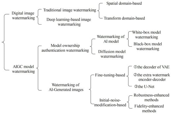 Methodology and scope: To ensure a comprehensive review of the literature, we employed a systematic search strategy across multiple databases, including PubMed, Web of Science, Scopus, IEEE Xplore, and arXiv. The used search keywords include but are not limited to “image watermarking”, “deep neural network watermarking”, “deep learning”, “latent diffusion model”, “image generation”, “AIGC”, and reasonable combinations. What is more, the search time for these studies is set to 15 December 2024. The corresponding title, abstract, and full text are sequentially browsed to find matching literature. This paper focuses on the image part and provides an overview of the existing image watermarking techniques. Firstly, the development history of four image generation technologies is reviewed, followed by the corresponding classification descriptions of digital image watermarking algorithms and AIGC model watermarking algorithms. Finally, the performance indicators of watermarking algorithms are briefly mentioned.