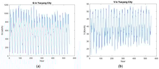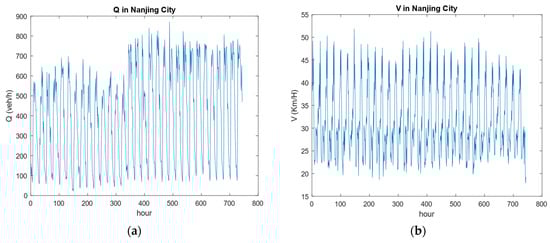 To analyze traffic flow characteristics, this study utilizes hourly data from a single road section in Nanjing (1–31 December 2015) and Yueyang (1–31 October 2020). Parameters, including hourly traffic volume (Q in Figure 2a and Figure 3a), hourly average vehicle speed (V in Figure 2b and Figure 3b), and headway, are extracted from the dataset (Figure 2c,d and Figure 3c,d). The data collected from the urban road section of Yueyang City in October 2020 and the RFID detection data from the urban road section of Nanjing City in December 2015 are used. Notably, traffic control policies in Yueyang caused intermittent data gaps, reducing the total sample to 552 h. Then, we estimate road density with Formulas (3) and (7), where the estimated section density is obtained via the conversion relationship between headway and density, and the fitting functions of flow density and flow speed are constructed.