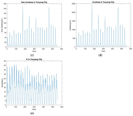 Sample data from Yueyang City. (a) Road section volume in Yueyang City; (b) speed in Yueyang City; (c) road section time headway in Yueyang City; (d) headway in Yueyang city; (e) road density in Yueyang City.