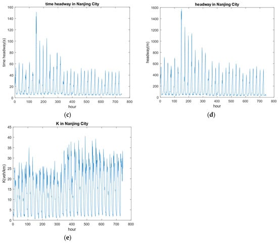 Sample data from Nanjing City. (a) Road section volume in Nanjing City; (b) speed in Nanjing City; (c) road section time headway in Nanjing City; (d) headway in Nanjing City; (e) road density in Nanjing City.