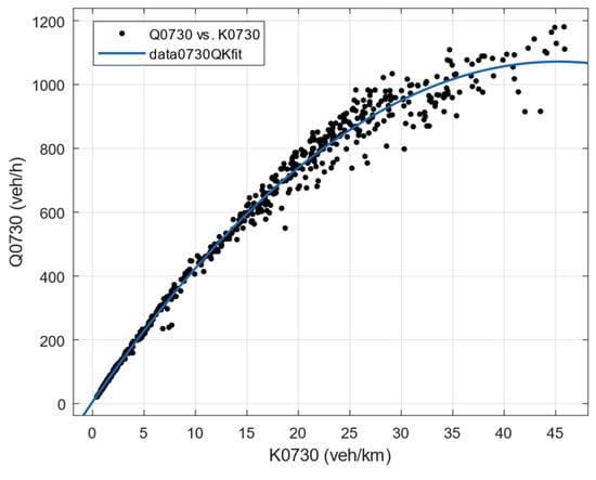 Traffic flow modeling relies on field data collection, which has transitioned from manual to automated methods due to the significant progress made in traffic and transportation technology, and many studies have been conducted to analyze traffic flow characteristics. Hall [1] analyzed traffic detection data from freeways via cusp catastrophe theory and, using a cusp catastrophe model and traffic data from freeways, also analyzed the occurrence of gaps in freeway operation data and the accompanying jumps observed in the behavior of speed–flow variables. Persaud and Hall [2] analyzed the traffic, speed, and occupancy data of expressways at 30 s intervals via catastrophe theory and reported that the theoretical model better the detection data fits and can be used for expressway event detection. Forbes and Hall [3] further explored the traffic flow model based on catastrophe theory via freeway data. Acha-Daza and Hall [4] further demonstrated the validity of catastrophe theory in describing traffic flow characteristics and demonstrated a method of improving model fitting based on the transformation of variables and axes (including the translation and rotation of axes). These early studies laid the theoretical foundation of catastrophe theory, which is used to construct traffic flow models based on detection data.