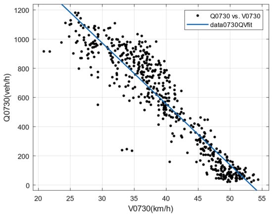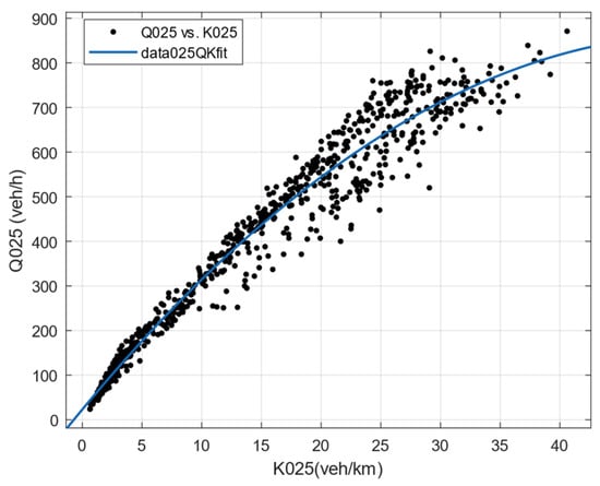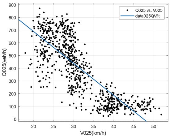 The fitting curve of the Nanjing data is shown in Figure 7 and Figure 8, where Figure 7 shows the fitting effect of section flow and section density. The fitting curve is shown in Equation (19), and the congestion density value of the Nanjing section is obtained as shown in Equation (20). Figure 7 also shows the fitting effect of section flow and speed. The fitting curve is obtained as shown in Equation (21), and the free flow speed of the Nanjing section is obtained as shown in Equation (22).