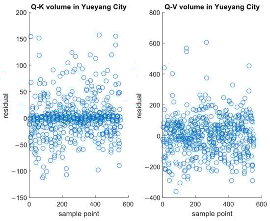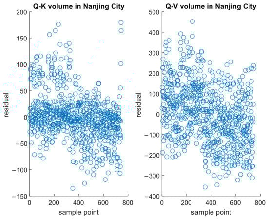 Based on Formulas (19) and (21), the fitting results can be compared with the observed data. RMSE, MAE, and MAPE are used to evaluate the fitting results, which are 45.07, 31.83, and 9.06% for Formula (19), and 142.37, 115.74, and 54.25% for Formula (21). Residual results are shown in Figure 9. In addition, in Chinese cities, the speed limit for urban roads with a central split line is 50 km/h, and Formula (22) represents the free flow speed, which keeps the same speed limit. Due to the difficulty of directly surveying density, Formula (20) is calculated from Formula (19), which has better fitting precision. Similarly, in Figure 9, the residual results from Formula (19) are shown as a Q-K volume diagram, and the residual results from Formula (21) are shown as a Q-V volume diagram. Both formulars can be used to estimate the volume; however, the Q-K volume diagram and Formula (19) fit better, and the data points exhibit a lack of concentration around the fitted regression line, as shown in Figure 8.