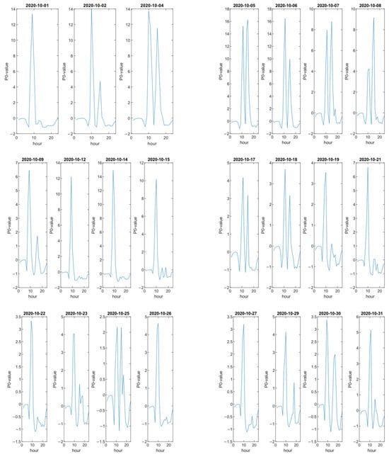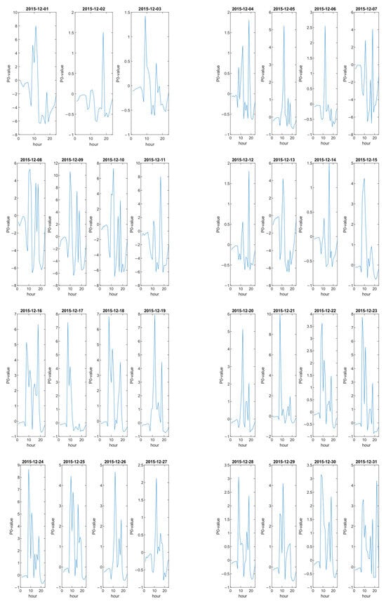 Using Formulas (8), (9), (20) and (22), we derive the traffic flow potential value for the Nanjing case study. The hourly computations over a 31-day period are visualized in Figure 14, with the y-axis indicating the potential value (Formula (8)) as P0 and the x-axis reflecting the hourly time sequence.