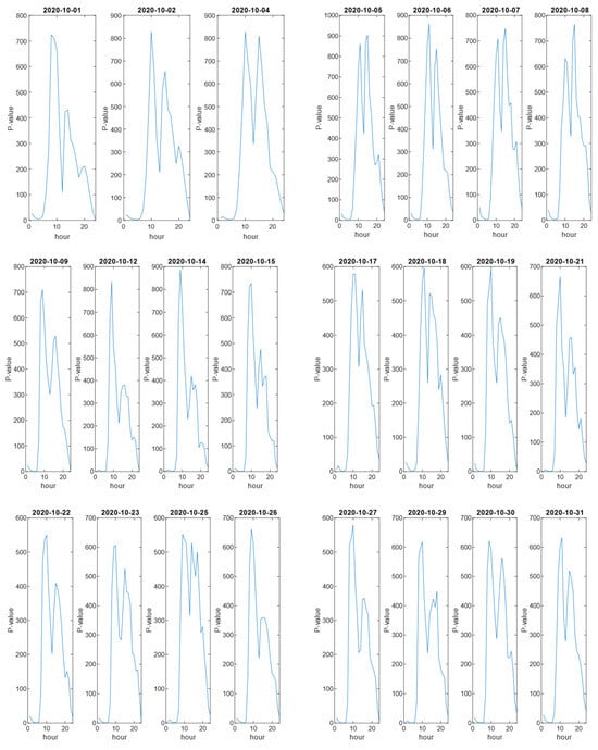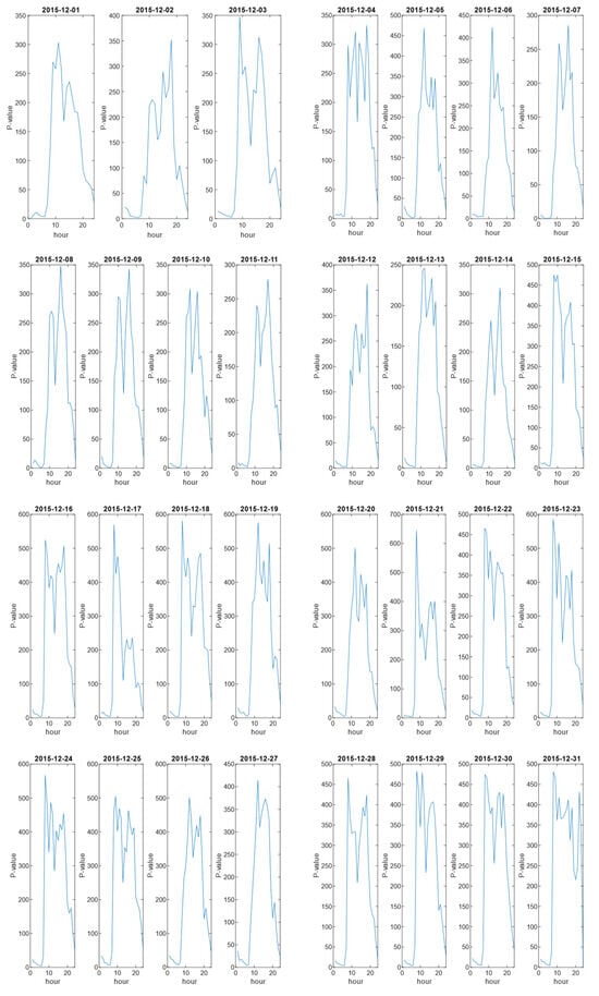 Considering the microscopic parameters of traffic flow, we calculated and obtained the characteristic values of traffic flow potential in Yueyang case scenario using Formulas (9), (14), (16) and (18), as shown in Figure 13. The y-axis represents the data-based calculation of the potential from Formula (14) as p-value, and the x-axis represents the hour series.