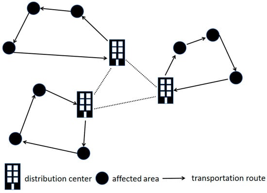 The research in this paper is based on a “many-to-many” distribution model, where multiple distribution centers serve multiple disaster-affected areas. The optimization objective is to minimize the distribution cost under the condition of meeting the best rescue time, where the distribution costs include vehicle dispatch costs, transportation fuel costs, and time penalty costs. These distribution centers store the goods needed by the affected areas, each with limited capacity. The geographical location of each distribution center is known, as are the locations and demands of each disaster-affected area. Each vehicle has a fixed capacity, and each disaster-affected area has time window constraints for delivery. The objective is to ensure that the demands of all affected areas are met, with each vehicle serving only one disaster-affected area at a time. For vehicle distribution, the vehicles must depart from the distribution center, serve the affected area assigned to them, and return to the original distribution center after completing the delivery. A schematic diagram of the emergency logistics route is shown in Figure 1.
