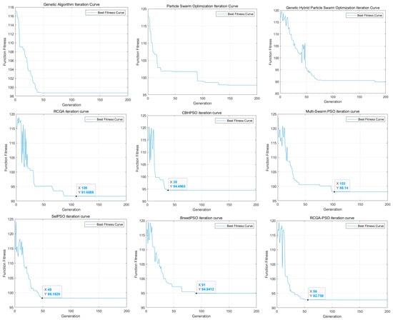 The results demonstrate that the proposed GHPSO algorithm outperforms standard GA and PSO in the given case study. However, a comparative analysis with advanced hybrid evolutionary algorithms is necessary to further validate its effectiveness. Therefore, six state-of-the-art algorithms—RCGA, CBHPSO, Multi-Swarm PSO, SelPSO, BreedPSO, and RCGA-PSO—were selected for comparison. As shown in Figure 4, GHPSO achieves the best optimization performance among all tested algorithms, further highlighting its superiority. To provide a more intuitive comparison of the improved algorithm with other algorithms, the best path diagrams of the GA algorithm, PSO algorithm, and GHPSO algorithm are shown in Figure 5.