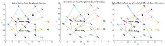 In the route optimization model aimed at minimizing the total cost of emergency logistics transportation, it is evident that the results obtained by the GHPSO algorithm are superior to those of the standard GA and the standard PSO algorithm. The total transportation cost using the GHPSO algorithm was reduced by 8.9% compared to the standard GA and by 8.1% compared to the standard PSO algorithm.