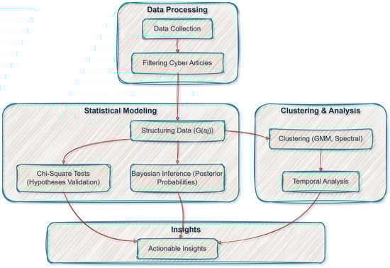 To address these challenges, this study proposes a novel mathematical framework integrating statistical modeling, clustering algorithms, and temporal analysis, as shown in Figure 1. The methodology includes chi-square tests for independence validation [15], Bayesian inference for dominance quantification [16], and advanced clustering techniques such as Gaussian Mixture Models (GMMs) [7] and Spectral Clustering [8] to uncover latent structures in a dataset of 9261 cyber-related news articles spanning 95 attack types and 29 industries. Temporal patterns were analyzed to identify periodic spikes and persistent threats.
