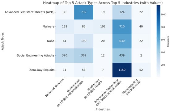 This study revealed several industry-specific insights into the distribution and prevalence of cyberattack types, highlighting significant vulnerabilities across various sectors. In the Information Technology and Telecommunications sector, Zero-Day Exploits emerged as the most dominant attack type, with 1150 occurrences, reflecting frequent targeting of cutting-edge technologies and infrastructure vulnerabilities. This sector had a moderately high average significance score of . Similarly, the Government and Public Administration sector exhibited a high concentration of Advanced Persistent Threats (APTs), accounting for 732 incidents. This underscores the strategic targeting of governmental systems, with a high significance score of , emphasizing the critical need for intelligence-driven cybersecurity defenses.