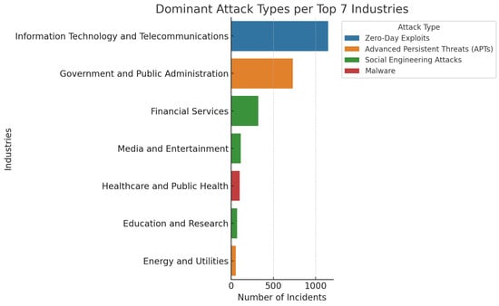 Figure A1, Figure A2, Figure A3, Figure A4, Figure A5, Figure A6, Figure A7 and Figure A8 show the distributions of attack types in different industries, like Information Technology and Telecommunication, Government and Public Administration, Financial Services, Healthcare and Public Health, Manufacturing and Industrial, Retail and E-commerce, Transportation and Logistics, and Energy and Utilities.