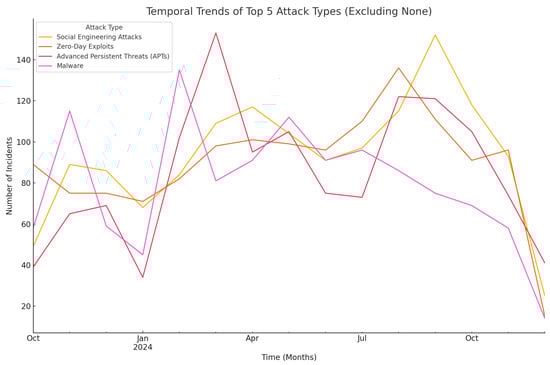 The results reveal a significant clustering of attack types, such as 1150 Zero-Day Exploits in IT and Telecommunications, and the dominance of APTs with a posterior probability of 1.0 in Government sectors. Temporal trends highlight dynamic variations, such as spikes in Zero-Day Exploits and persistent Social Engineering Attacks (1397 occurrences across industries). For instance, spikes in Zero-Day Exploits were observed to coincide with high-profile announcements of software vulnerabilities, suggesting the need for heightened vigilance and resource allocation during such periods.
