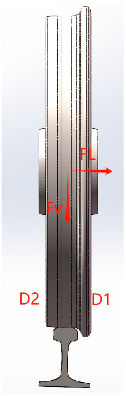 Computer simulations were used to apply loads to the wheel, with concentrated forces representing the forces exerted by the rail on the wheel [22]. Static force calibration methods, similar to those used in laboratory tests for force-measuring wheel sets, were employed to simulate static force loading on the wheel. The loading conditions were as follows: