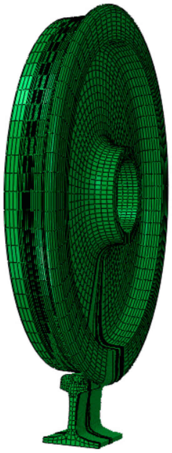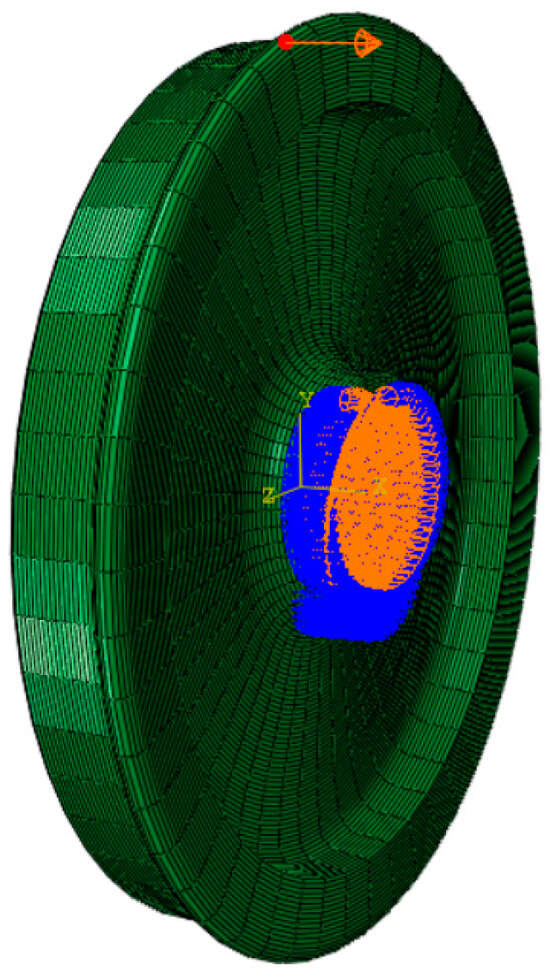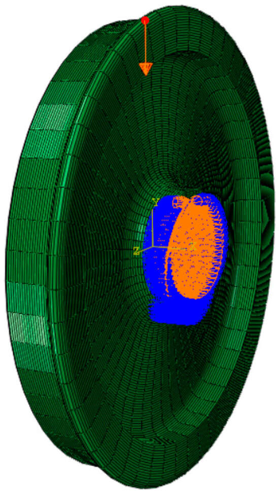 This study develops a computational model based on the actual three-dimensional dimensions of the wheel of a certain locomotive and a 60 kg/m rail [20]. The locomotive wheel has a diameter of 920 mm and features an LMA-type tread. Due to the complexity of direct modeling in ABAQUS, SolidWorks was used for CAD modeling. The components were first modeled in SolidWorks and then imported into Hypermesh for mesh generation. Meshing is a critical step in the preprocessing phase, as the quality of the mesh directly influences the accuracy of the computational results. In Hypermesh, the element size was set to 5, with the element density maintained at the default value of 1. Approximately 120 finite elements were generated per wheel [21]. Finally, the components were imported into ABAQUS, where material properties were assigned to the model. The wheel material was specified as steel with the following properties: