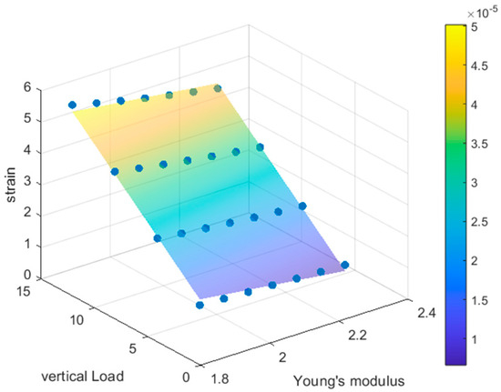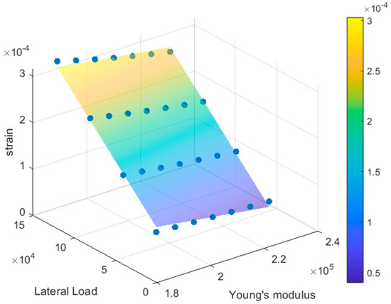- The approximate function was constructed based on Equations (15) and (16) to establish the relationship between strain and load, as well as Young’s modulus.