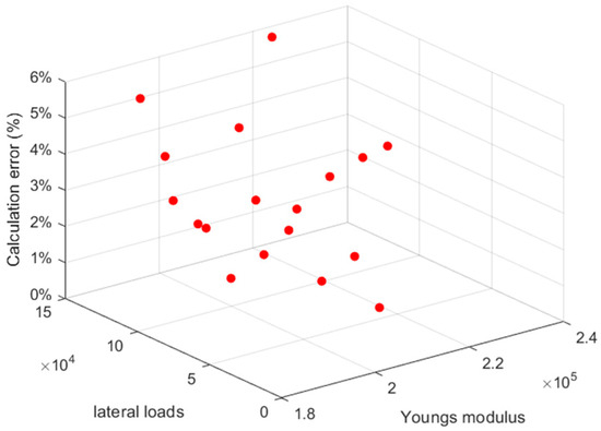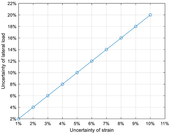 To better illustrate the effect of uncertainties in Young’s modulus and strain on the uncertainties of vertical and lateral loads, the data from Table 5 and Table 6 are presented graphically in Figure 12.
