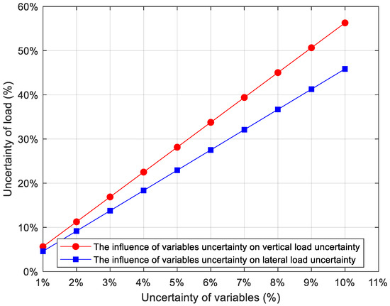 Similarly, to better illustrate the effect of strain uncertainty on the uncertainties of vertical and lateral loads, the data from Table 3 and Table 4 are graphically presented in Figure 10 and Figure 11, respectively.