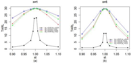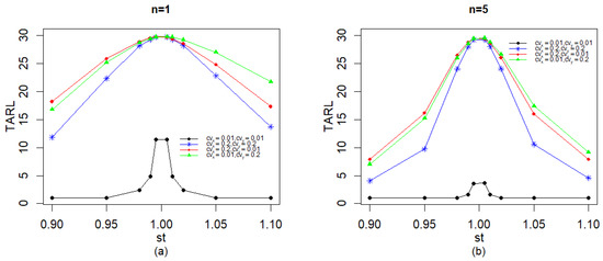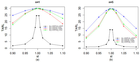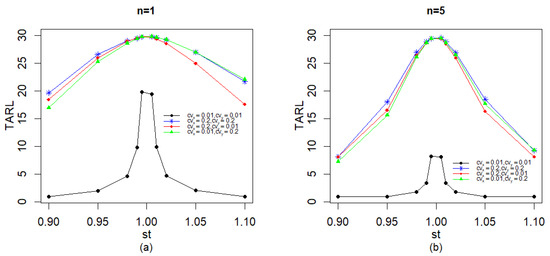 Observing Figure 1, Figure 2, Figure 3, Figure 4 and Figure 5, it can be seen that the size of the sample has a significant effect on the performance of the STRZ scheme, regardless of whether it is monitoring upward or downward shifts, that is, the larger the sample size, the better the monitoring performance of the STRZ scheme. For example, as shown in Figure 2, when and , then the STRZ scheme’s performance for monitoring is and . When monitoring , then the performance is and . While a larger sample size increases the STRZ scheme’s monitoring performance, it also increases the cost of monitoring. The standard “Conventional Control Charts” (GB/T 4091-2001) recommends a sample size of four or five. In actual production processes, the sample size should be chosen based on practical circumstances.