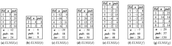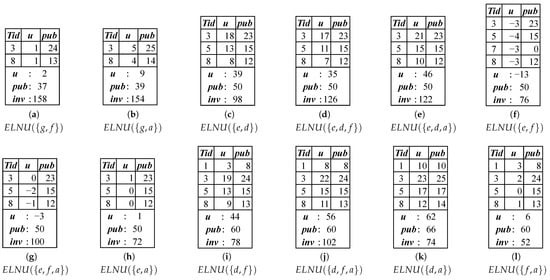 For example, item a appears in transactions , , , and . Since a is a positive item, the values are calculated as follows: , , , and . As a result, = = 66. As another example, item c appears in transactions , , , and . Since c is a negative item, it is necessary to check whether for each transaction containing c to determine . For transactions and , + = 10 + (−12) ≤ 0 and + = 4 + (−6) ≤ 0, so = = 0. For transactions and , + = 25 + (−18) = 7 > 0 and + = 14 + (−3) = 11 > 0, so = 7 and = 11. Consequently, = 0 + 7 + 11 + 0 = 18. The values for each item in each transaction are summarized in Table 6. Now, let us calculate for the itemset . It appears in transactions , , , and . (, ) is equal to ((a, ), (d, ), (f, )) = (10, 10, 8) = 8. In a similar way, (, ) = 24, (, ) = 15, and (, ) = 13. Therefore, () = 8 + 24 + 15 + 13 = 60. For another itemset, , the value is calculated as () = (, ) + (, ) = (10, 0) + (25, 7) = 7.