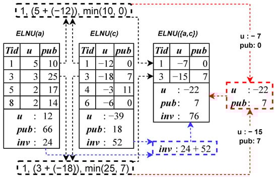 For example, consider the itemset , which appears in transactions , , , and . The utility of in is calculated as ) = × + × + × = 5 × 1 + 1 × 5 + 2 × (−1) = 8. Similarly, the utilities of in transactions , , and are obtained as 22, 15, and 8, respectively. Consequently, the utility of in the database is = 8 + 22 + 15 + 11 = 56.