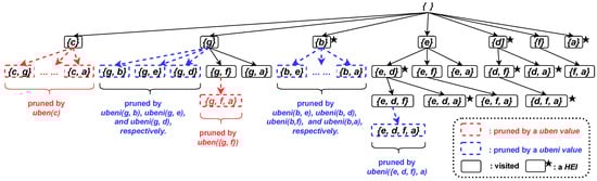 To address this limitation, the problem of high-efficiency itemset mining (HEIM) [23] was recently introduced, considering both utility and investment. According to HEIM, the importance of an itemset is determined by dividing its utility by its investment, defining this ratio as efficiency. HEIM aims to find all itemsets whose efficiency meets a user-defined threshold. However, due to the nature of the efficiency calculation, the efficiency measure does not exhibit monotonic or anti-monotonic properties. In other words, the efficiency values of the itemsets do not allow predicting in advance whether their supersets (or subsets) will be efficient, which complicates the problem computationally, due to the large search space. The first solution to this problem, the HEPM [23] algorithm, introduced an upper-bound called an efficiency upper-bound (), which overestimates the efficiency values of itemsets to satisfy anti-monotonicity, aiding in pruning the search space. HEPM uses a level-based candidate generation and testing strategy, conducting multiple database scans to generate candidates and filter them by calculating their actual efficiency, making it time-consuming due to the extensive number of scans and candidates. The working principle of HEPM is as follows. It employs a two-phased approach to identify in a dataset. In Phase 1, the algorithm explores the search space using a breadth-first search strategy. It begins by scanning the dataset to collect the values for each item. Items whose values meet a given threshold are identified as candidate 1-itemsets. Subsequently, the algorithm iteratively generates candidate 2-itemsets from 1-itemsets, candidate 3-itemsets from 2-itemsets, and so on, continuing until no new candidates can be generated. In each iteration, the algorithm produces candidate (k + 1)-itemsets based on the current k-itemsets. A new (k + 1)-itemset is formed by appending the last item of one k-itemset to another k-itemset, provided they share the same (k − 1) items. During the examination of the search space, the newly generated candidates are filtered based on their values. The final result of Phase 1 is the complete set of candidate itemsets. In Phase 2, the algorithm scans the database for each candidate itemset to calculate its actual efficiency. Itemsets having efficiencies that meet the threshold are returned as , which constitute the final output.