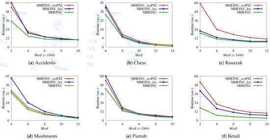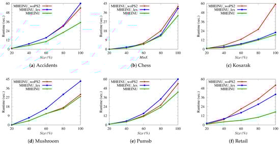 For example, for the Accidents dataset, when considering 20% of the dataset, the algorithms exhibited nearly identical runtimes. However, as the dataset size increased, MHEINU demonstrated a growing performance advantage. Specifically, for the Accidents dataset at 20%, 40%, 60%, 80%, and 100% sizes, MHEINU ran 0.8 and 0.13 s faster than MHEINU_woPS2 and MHEINU_lex at 20%, 2.29 and 1.8 s faster at 40%, 5.14 and 5.32 s faster at 60%, 8.59 and 8.93 s faster at 80%, and 18.41 and 24.21 s faster at 100%. Similarly, for the other datasets, while the algorithms had similar runtimes at the lowest dataset sizes, MHEINU’s superiority became increasingly evident as the size grew. At the 100% dataset size, the results for the other datasets were as follows. For the Chess dataset, MHEINU outperformed MHEINU_woPS2 by 9.84 s and MHEINU_lex by 7.1 s. On the Kosarak dataset, MHEINU was 40.1 s faster than MHEINU_woPS2 and 3.02 s faster than MHEINU_lex. In the case of the Mushroom dataset, MHEINU ran 4.2 s faster than MHEINU_woPS2 and 15.6 s faster than MHEINU_lex. For the Pumsb dataset, MHEINU was 10.55 s faster than MHEINU_woPS2 and 16.28 s faster than MHEINU_lex. Finally, for the Retail dataset, MHEINU exhibited a remarkable runtime advantage, being 34.37 s faster than MHEINU_woPS2 and 22.3 s faster than MHEINU_lex. In summary, the results highlight that MHEINU exhibited better scalability compared to the other algorithms as the dataset size increases.