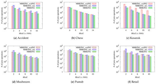 For example, for the Accidents dataset, MHEINU achieved approximately 1.63 times fewer join operations than MHEINU_woPS2 and about 2.41 times fewer than MHEINU_lex when = 10,000. This trend persisted at lower thresholds; when 8000, MHEINU performed approximately 1.79 times fewer join operations than MHEINU_woPS2 and about 2.67 times fewer than MHEINU_lex. When = 6000, MHEINU again showed a notable reduction, requiring roughly 1.81 times fewer join operations than MHEINU_woPS2 and about 3.18 times fewer than MHEINU_lex. When 4000, MHEINU executed approximately 2.09 times fewer join operations than MHEINU_woPS2 and about 3.61 times fewer than MHEINU_lex. Finally, at the lowest threshold ( = 2000), MHEINU performed around 2.16 times fewer join operations than MHEINU_woPS2 and about 3.71 times fewer than MHEINU_lex. Comparisons with respect to the smallest threshold value on other datasets were as follows. On the Chess dataset, when = 6, MHEINU performed approximately 1.42 times fewer join operations than MHEINU_woPS2 and approximately 1.32 times fewer join operations than MHEINU_lex. On the Kosarak dataset, when = 4000, MHEINU showed a significant reduction and required approximately 4.63 times fewer join operations compared to MHEINU_woPS2 and approximately 1.75 times fewer join operations than MHEINU_lex. On the Mushrooms dataset, when = 2, MHEINU performed approximately 1.14 times fewer join operations than MHEINU_woPS2 and about 2.30 times fewer join operations than MHEINU_lex. On the Pumsb dataset, when = 2000, MHEINU required approximately 1.19 times fewer join operations than MHEINU_woPS2 and about 1.98 times fewer join operations than MHEINU_lex. Finally, for the Retail dataset, when = 2, MHEINU required approximately 2.49 times fewer join operations than MHEINU_woPS2 and about 5.84 times fewer join operations than MHEINU_lex.