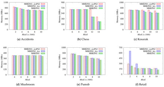 Furthermore, as can be seen in Figure 8, the proposed MHEINU algorithm had a lower memory usage compared to the others in all experiments. This difference became especially pronounced at higher threshold values. At lower threshold values, the decreasing differences in memory usage between the algorithms can be attributed to the expansion of the search space. In larger search spaces, the algorithms tended to explore to similar depths, due to the increasing length of the itemsets to be explored, thus decreasing the differences in memory usage.