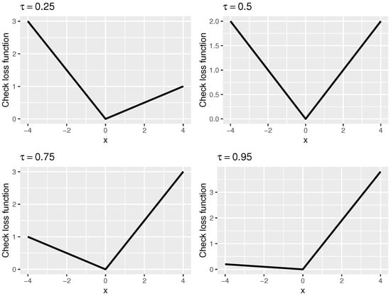 where is the piecewise linear check loss and represents the quantile level. In Figure 1, we show the loss function for different values of . When , the loss function becomes . To see why this makes sense, we note that it is well-known that given a sample , the minimizer of is the sample median (the minimizer of the least squares loss is the sample mean). For other values of , the loss function has a similar shape to absolute value function but is skewed so that it can recover other quantiles. For details, see [6]. The intercept would be omitted in the following for the simplicity of notation.