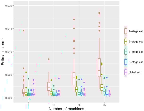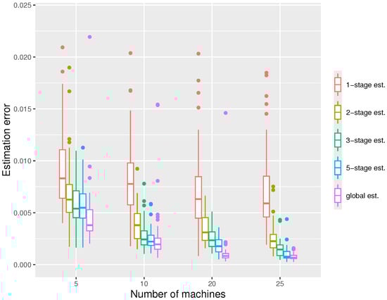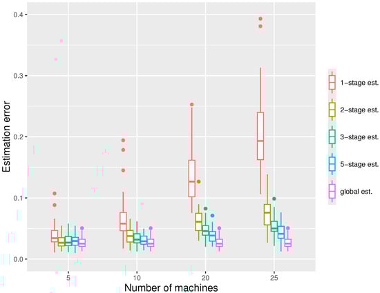 For the first simulation, we fix the whole sample size and vary the number of machines m, with the results shown in Figure 2. We can observe that the errors decrease with the number of stages used, and with a five-stage estimator, the errors are usually close to those of the global estimator. We see that the one-stage estimation is typically insufficient, with much larger errors. For , the estimator quickly converges with a very small number of stages, while for a larger number of machines, more stages are probably required. We also note that the estimation errors increase with the number of machines m.