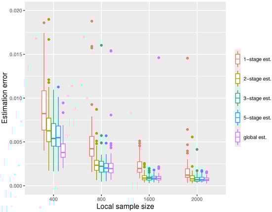 In the third simulation, we fix and increase the local sample size n. Again, we see in Figure 4 that the errors decrease with n. When the local sample size n is sufficiently large, two or three stages suffice for the distributed estimators to gain good performances comparable to the global estimators. We also note that when n is small (), there is still a significant gap between the distributed estimator and the global estimator after five stages.