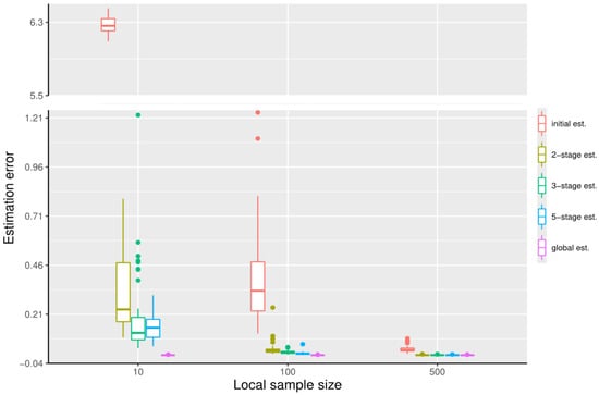 We now illustrate what happens if n is very small. We set , and , with the other settings unchanged as in the first simulation. We can observe from Figure 5 that when the first machine has significantly less data, the initial estimator would not be accurate enough. Correspondingly, the distributed estimators perform much worse, and, even after five stages, the errors are still large; increasing the number of stages further does not help.