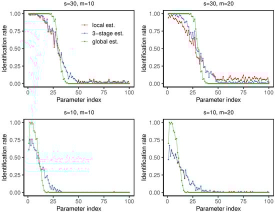 In our simulations, we set . As shown in Figure 7 and Table 2, with the special setting of , the identification rates decrease as the parameter index grows. At , the three-stage estimator slightly outperforms the local estimator, with higher identification rate for the parameters with large magnitudes and a lower misclassification rate. At , the local estimator and the three-stage estimator have almost identical performance. We can also observe that the misclassification rate of the three-stage distributed estimator increases slightly with the number of machines. In addition, we report the computational time of the four cases, each using 100 repetitions, as shown in the footnotes of Table 2. Our algorithm is implemented in R (R-4.4.2) on our desktop computer with 12th Gen Intel(R) Core(TM) i5-12400F 2.50 GHz and 16 GB RAM.