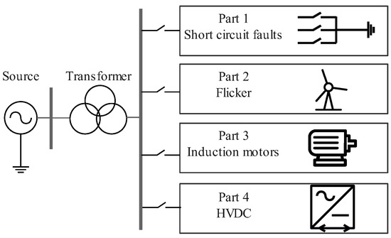 PQDs are usually caused by faults, load changes, or the operation of nonlinear devices within a new-type power system. This paper focuses on several typical types of single and mixed PQDs, which are listed in Table 1. An overview of the proposed simulation model is shown in Figure 2, which is established in PSCAD/EMTDC. Part 1 is used to simulate voltage sags, voltage swells, and momentary interruption caused by short-circuit faults. The duration time of these disturbances is adjusted by changing the duration time of short-circuit faults, and the types of disturbances are varied based on the specific short-circuit fault configuration. Part 2 focuses on flicker disturbances, which are caused by minor, periodic fluctuations in system frequency. Part 3 is a branch operating under normal conditions, where induction motors are connected in series with a step-down transformer, which may result in oscillation disturbances. Part 4 simulates harmonic disturbances, which are usually caused by converter stations in high-voltage transmission systems. The components and amplitudes of harmonics are varied by changing the types of rectifier bridges, their configuration, and the types of transformers used.