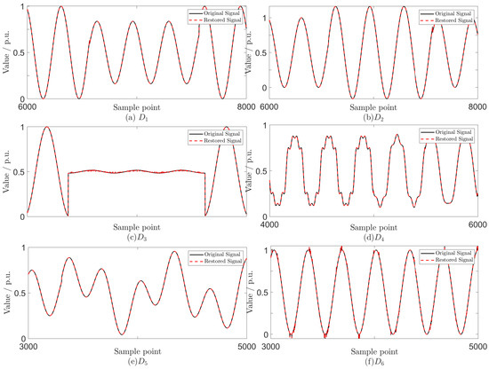 Comparison between original signals and restored signals, where figure (a–f) correspond to to , respectively.