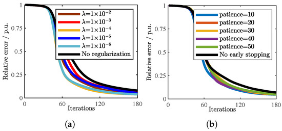 To investigate the impact of regularization parameters on the enhanced gradient descent algorithm, we compared our proposed method to the traditional gradient descent algorithm. Figure 5a illustrates the results based on experiments conducted using 1800 sets of PQD simulation data with patience = 50, and shows the relative error over 180 iterations for various regularization parameters, as well as a case with no regularization. It is evident that under the same number of iterations, the relative error with regularization is smaller than without regularization. Notably, the presence or absence of regularization had no significant impact on the running time, with all cases completing 180 iterations in approximately 60 ms.