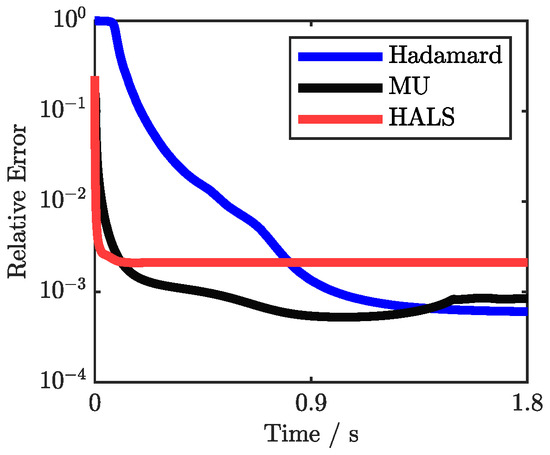 Based on the convergence performance comparison with other optimization algorithms shown in Figure 6, while Multiplicative Updates (MU) and Hierarchical Alternating Least Squares (HALS) algorithms demonstrate superior overall convergence rates, the Hadamard decomposition exhibits unique convergence characteristics. The Hadamard decomposition maintains stable convergence behavior without oscillations, suggesting reliable performance for practical applications. This convergence pattern, combined with the algorithm’s structured nature and lower computational complexity, represents an effective balance between computational efficiency and optimization accuracy.