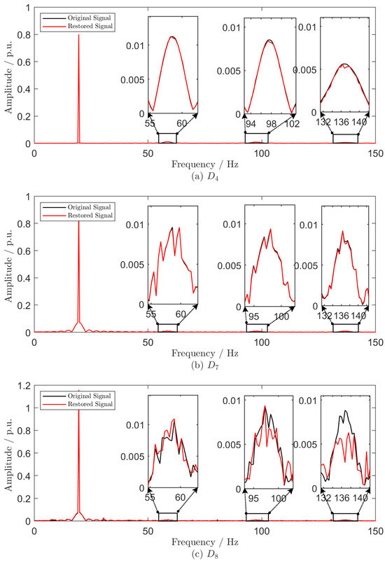 In new-type power systems, the widespread integration of power electronic devices, renewable energy sources, and non-linear loads introduces many harmonic components into the power grid. These harmonics are crucial indicators for system state assessment and power quality evaluation. Therefore, it is essential to evaluate the ability of the proposed scheme to preserve frequency domain information. Figure 7 presents a comparison of the frequency spectra between original and restored signals for , , and , revealing that the proposed scheme effectively retains a substantial portion of the frequency domain information. The preservation of spectral content highlights its potential applicability in scenarios that require comprehensive analysis across both the time and frequency domains.