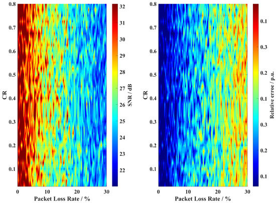 In power system data transmission, packet loss during network communication may significantly impact the effectiveness of data compression schemes, potentially leading to degraded reconstruction quality and compromised system monitoring capabilities. To evaluate this impact, the packet loss effect on reconstruction performance is systematically analyzed across different CRs. In this study, packet loss is simulated by randomly setting elements in the decomposed matrices to zero, with the packet loss rate defined as the ratio of zeroed elements to the total number of matrix elements. Figure 8 illustrates the relationship between packet loss rate, CR, and reconstruction quality metrics (SNR and RE), revealing that performance degradation exhibits a non-linear relationship with both packet loss rate and CR. The results demonstrate the robustness of the proposed scheme under various network conditions.